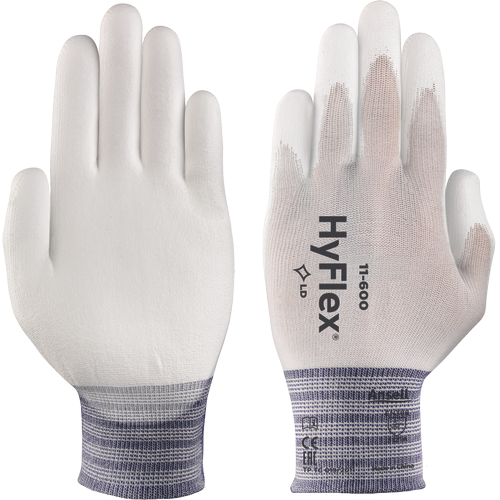• száraz környezetben végzett finom és könnyű munkára alkalmas fehér varratmentes kötött nylon kesztyű, rugalmas kötött mşizsettával, poliuretán réteggel a tenyéren és az ujjakon