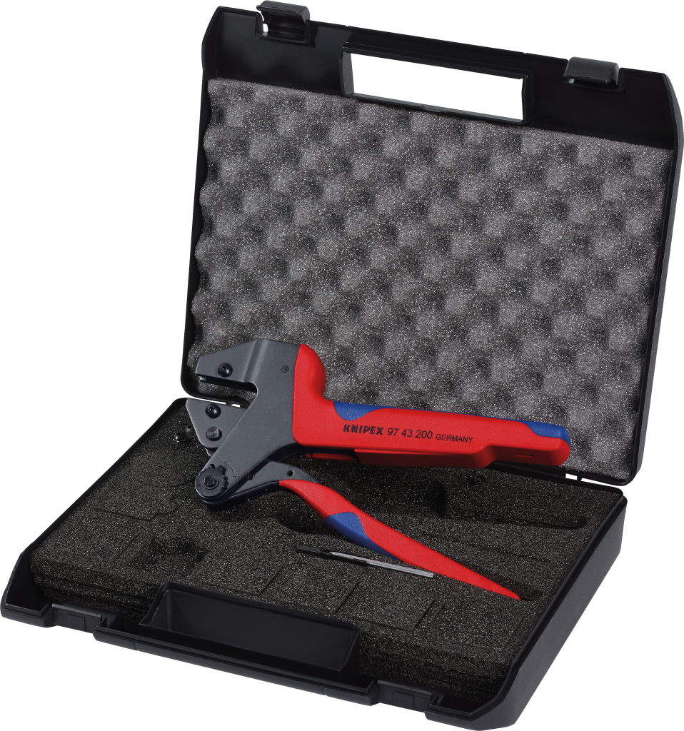 - műanyag kofferben habosított anyagból készült betéttel krimpelő betétek és pozicionáló segédeszközök tárolására szolgáló üregekkel