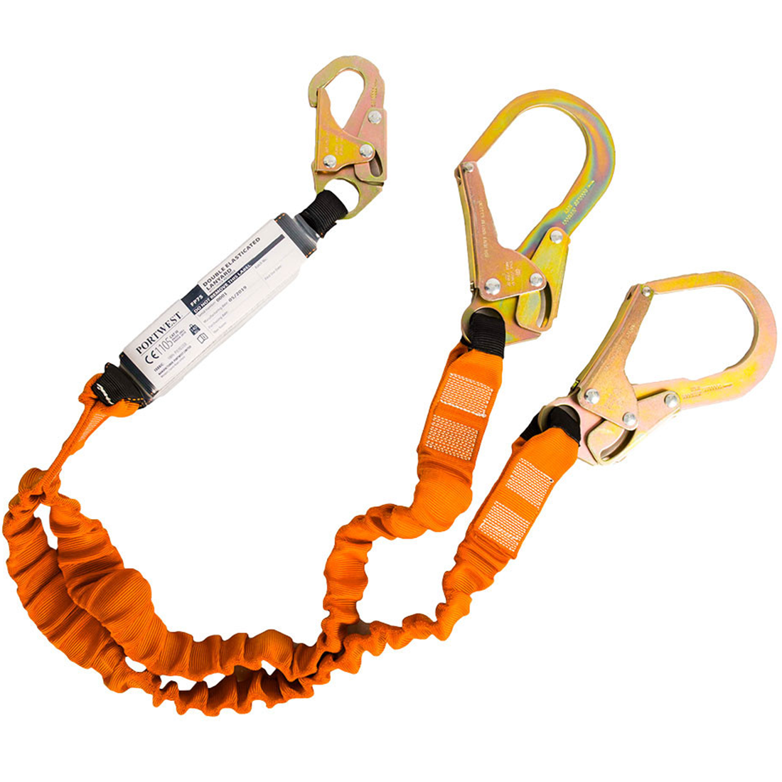 Kettős végződésű energiaelnyelős kötélzet karabinerekkel. 140 kg maximális terhelhetőség és 180 cm hosszúság beleértve a csatlakozókat.
