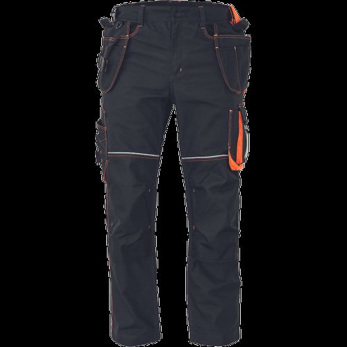 • férfi munkanadrág rugalmas derékkal • 2 oldalsó zseb, 2 repülőzseb szerszámtartó hurokkal, 1 átlátszó zseb az igazolvány számára, D-gyűrű • 2 hátsózseb • kalapácstartó kontrasztos színben • megerősített térdrész, térdvédőtartó • 5 cm-rel meghosszabbítható nadrágszárak • a nadrágszár hátsó, alsó része megerősített • dekoratív, figyelemfelkeltő varrás színes cérnával