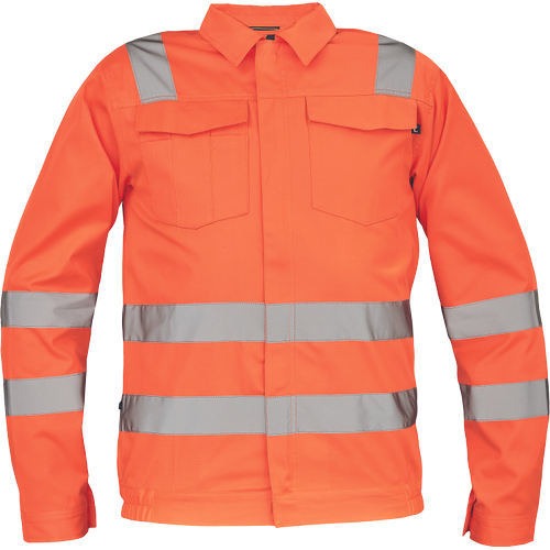 • férfi Hi-Vis kabát 5 cm széles fényvisszavető csíkokkal • cipzáras, tépőzáras hajtókával • 2 nagy hajtókás mellkasi zseb • rugalmas oldalsó betétek a kabát alján • tépőzáras mandzsetta
