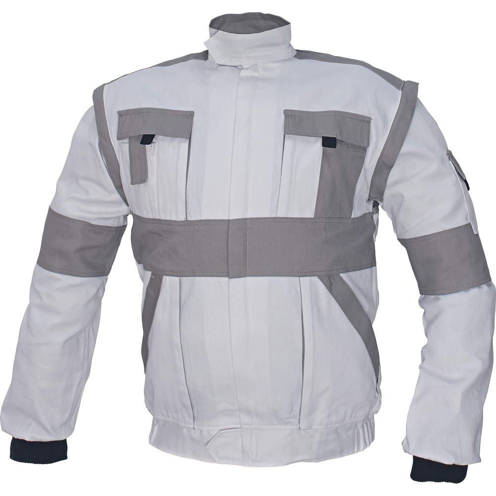 • férfi munkakabát cipzárral • levehető ujjak • 2 első zseb • 2 dupla mellzseb patentokkal • 1 kis zseb a bal ujján • megerősítés a váll-és könyökrészen • rugalmas mandzsetta és alsó szegély