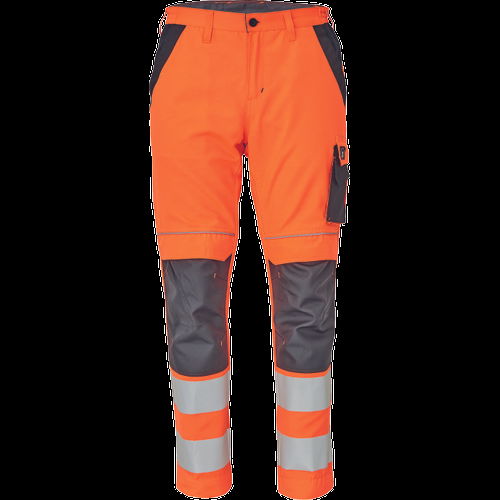 • férfi HI-VIS munkanadrág rugalmas derékkal • 2 első zseb, 1 oldalzseb a bal száron, 2 hátsó zseb • 2 kis hátsó zseb a jobb száron • nyomtatott 7,5 cm-es fényvisszavető csíkok a szárak alsó részén • fényvisszavető szegés • Oxford 600D megerősített térdrész, térdvédőtartó • leengedhető szárak