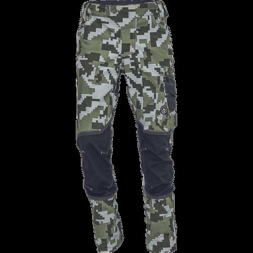 férfi munkanadrág innovatív, rugalmas TRIFIBETEX® anyagból, CORDURA® betétekkel digitális terepmintával, elöl 2 ékzseb, hátul 2 tépőzáras foltzseb, bal oldalt nagy multifunkciós zseb, jobb oldalt multifunkciós vonalzó, kés és ceruzatartó, fém "D" gyűrű, rugalmas derék, hosszabbítható szárhossz, fényvisszavető elemek, dekoratív tripla varrás kontrasztos színnel, kalapácstartó