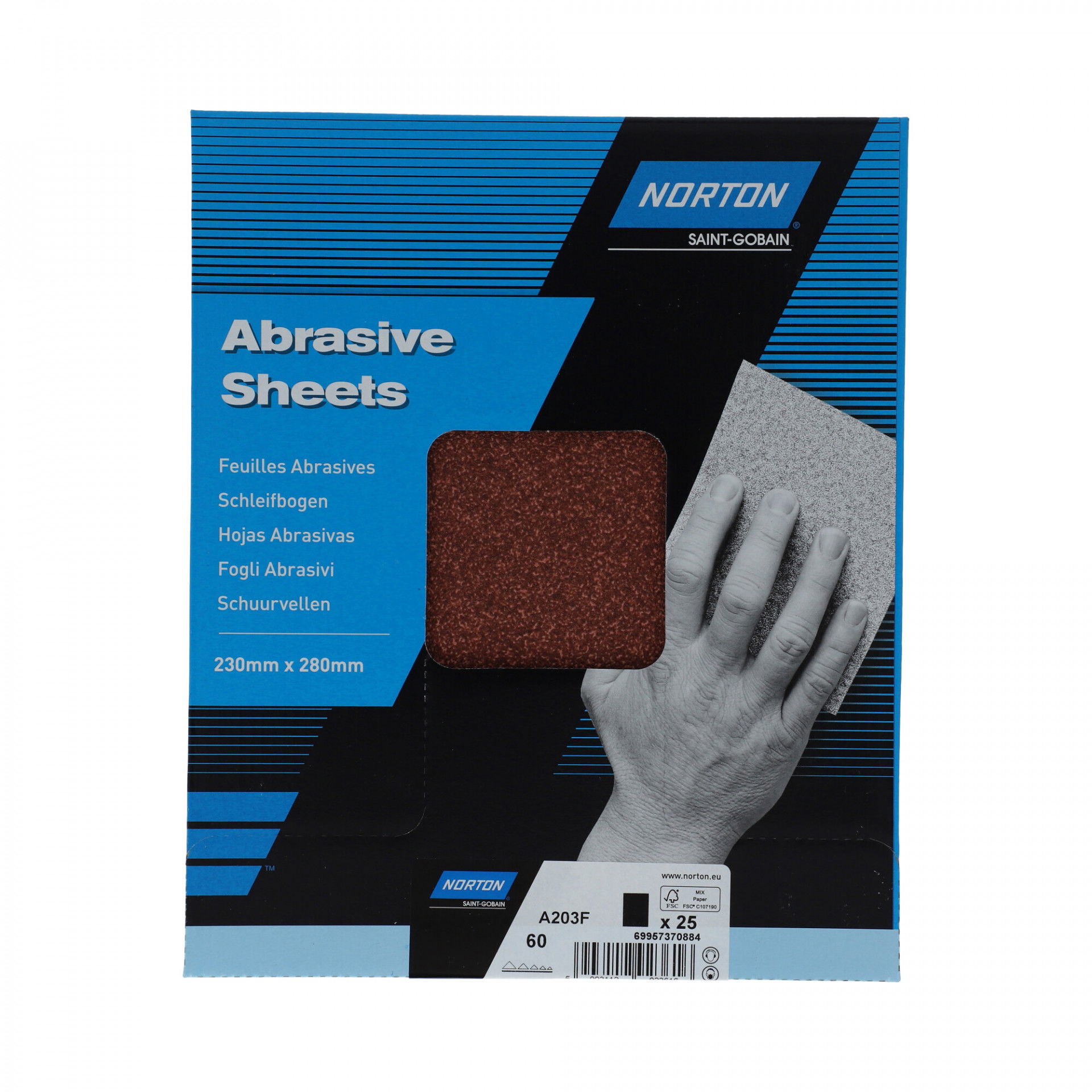 Norton Clipper A203F univerzális csiszolópapír minden fa csiszolásához. Alumínium-oxid szemcséjével és FSC® tanúsítvánnyal ez egy nagyon megfizethető lehetőség. Az FSC® tanúsítvány garantálja a felelős származást és a környezetbarátságot. Az alumínium-oxid szemcsék kiváló eredményt adnak fán, lakkon és vakolaton.