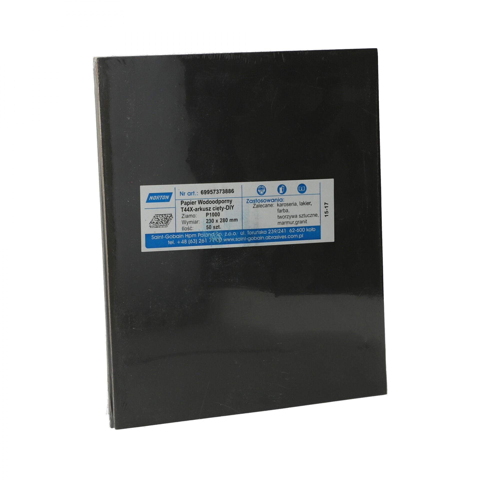 A Norton T44X vízálló csiszolópapír nagy teljesítményű szilíciumkarbid szemcsével nedves vagy száraz használatra alkalmas, nedves használat esetén tisztább felületet biztosít csiszolás közben. Gyors anyageltávolítás és simább és fényesebb felület elérése, ideális lakkozott felületeken való használatra és fémekhez. Festék- és lakkburkolatok, műanyagok, vas- és színesfémek csiszolására, polírozására is szolgál. Használható önmagában, csiszolótömbbel, kapcsos rögzítésű elektromos vagy akkumulátoros csiszológéppel.