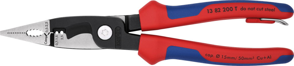 Szerelőfogó krimpelő funkcióval,leesés ellen bizt. 200 mm, csupaszítás 0,75-2,5 mm2, kábelvágás 15 mm 0,5-2,5 mm2 érvéghüvelyhez