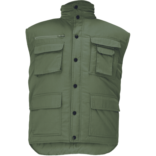 • bélelt mellény állógallérral • hosszított hátrész • műanyag patentokkal