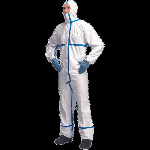 CE III. osztályba, a 4. , 5. és 6. típusba tartozó, vegyszeroldatokkal, azbeszttel és porral szemben ellenálló, antisztatikus, vízálló Tyvek Classic Plus (DuPont) overall csuklyával és leragasztott varratokkal
