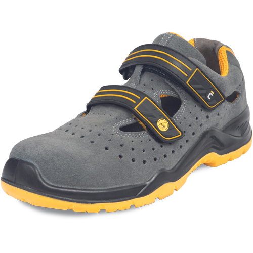 » biztonsági szandál szürke-sárga színkombinációban » teljes hosszában perforált nubuk bőr felsőrész » olajálló, csúszásgátló talp kettős sűrűségű poliuretánból » kényelmes, perforált belső talpbetéttel, energiaelnyelő sarokkal, kompozit lábujjvédővel, és kompozit köztappal » ESD védelem » nem tartalmaz fém alkatrészeket