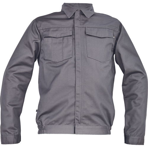 • férfi munkakabát • cipzáras, tépőzáras hajtókával • 2 nagy hajtókás mellkasi zseb • rugalmas oldalsó betétek a kabát alján • tépőzáras mandzsetta • 65% PES/35% pamut, 195 g/m2